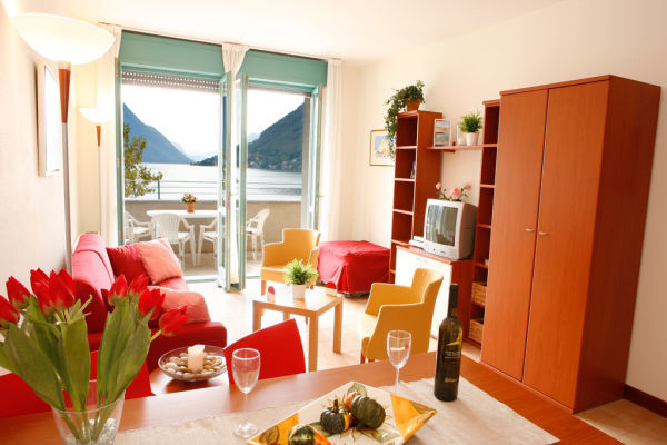 PALAZZO-TRILOCALE 6 PERSONE VISTA LAGO PLUS: Questo moderno appartamento offre l'ambiente ideale per un soggiorno divertente e rilassante con vista sul Lago di Lugano. L'appartamento dispone di 2 camere da letto, una matrimoniale ed una doppia o con letto a castello, ed il soggiorno è arredato con un divano letto matrimoniale e una cucina abitabile ben attrezzata. Moderno bagno con vasca o doccia.