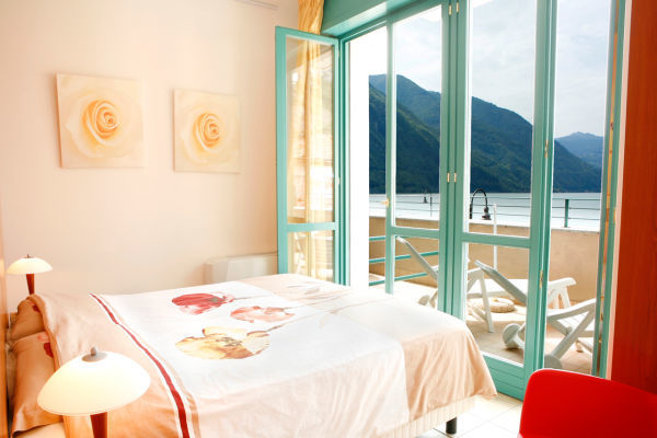 PALAZZO-BILOCALE 4 PERSONE VISTA LAGO DELUXE: Appartamento con un moderno soggiorno open space con accesso diretto al balcone privato dalla splendida vista lago. Zona pranzo con moderno angolo cottura ideale per preparare sia pasti semplici e veloci che pranzi più ricercati. La zona notte comprende una camera da letto principale con letto matrimoniale (che all'occorrenza può essere separato in due letti singoli) e il divano del soggiorno che si trasforma in un letto matrimoniale per 2 persone. Bagno completo con vasca, bidet e WC.