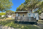 Happy Premium con terrazza in legno coperta a metà e piccola piastra elettrica.