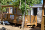 Happy Premium con terrazza in legno coperta a metà e piccola piastra elettrica.