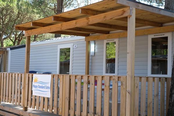 Happy Relax (ex Standard Extra) con terrazza in legno coperta a metà e piccola piastra elettrica.