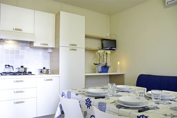 Le sistemazioni sono dotate di servizi privati, aria condizionata (gratuita per 10 ore al giorno), riscaldamento (gratuito per 10 ore al giorno), angolo cottura, fornello elettrico o a gas, frigorifero, microonde, prima fornitura di biancheria da letto e Tv. Gli Chalet Comfort Dog sono di 36 mq e dispongono di una camera matrimoniale e una camera con letti a castello; i Lodge Comfort Plus sono di 30 mq e sono composti da soggiorno con divano letto singolo, una camera da letto matrimoniale e una camera con letti singoli.